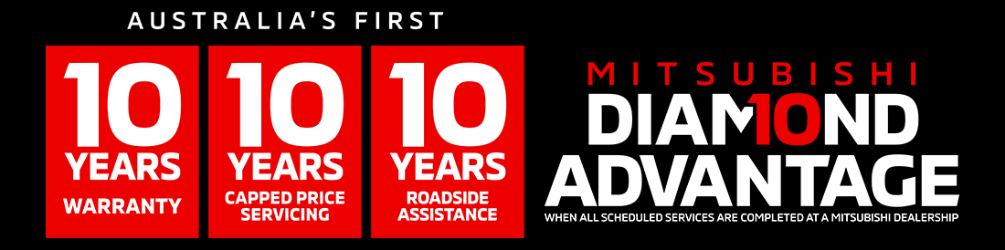 * Up to 10 years from the date of first registration or 200,000km (whichever comes first) New Vehicle Warranty when all scheduled services are completed within the specified service intervals at a Mitsubishi Dealership (or if not, 5 years/100,000km warranty applies). 10 year or 150,000km (whichever occurs first) Capped Price Servicing, comprised of the first 10 scheduled services (at 15,000km/12 month scheduled intervals). Any non-scheduled service/repair items are at an additional cost. Up to 10 years Roadside Assistance, comprised of an initial 12-month period extended for further periods of 12 months upon completion of each eligible Capped Price Service (up to a maximum of 10 annual Roadside Assistance periods in total). Eligibility conditions and exclusions apply, full terms and conditions for Diamond Advantage 10 10 10 can be found here: https://www.mitsubishi-motors.com.au/owners/diamond-advantage.html